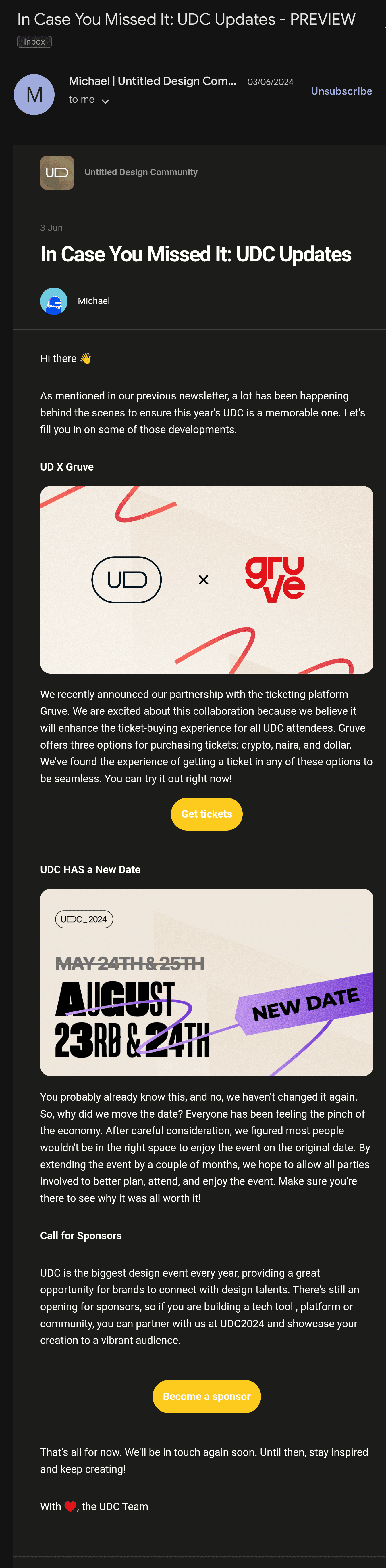 On email, I built out the campaign strategy to reach and engage thousands of community members across every stage of the funnel using Nas.io. From early announcements to last chance reminders, the emails were intentional and timed to drive action.